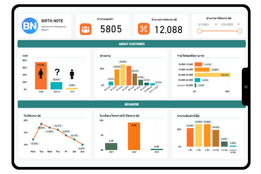 สิ่งที่เราภาคภูมิใจนำเสนอคือ ระบบรายงานอัจฉริยะ (Interactive Intelligent Report) ที่จะเปลี่ยนข้อมูลการสแกน QR Code ของผู้บริโภคให้กลายเป็นข้อมูลเชิงลึกที่มีคุณค่า ระบบจะแสดงผลข้อมูลในรูปแบบของแดชบอร์ด (Dashboard) ที่เข้าใจง่าย ไม่ว่าจะเป็นจำนวนการสแกน, พื้นที่ที่มีการสแกนมากที่สุด, ข้อมูลประชากรของผู้สแกน, หรือสินค้าที่ได้รับความนิยม คุณสามารถนำข้อมูลเหล่านี้ไปวิเคราะห์พฤติกรรมผู้บริโภค, ปรับกลยุทธ์การตลาด, หรือวางแผนการผลิตสินค้าให้ตอบสนองความต้องการของตลาดได้อย่างแม่นยำในอนาคต